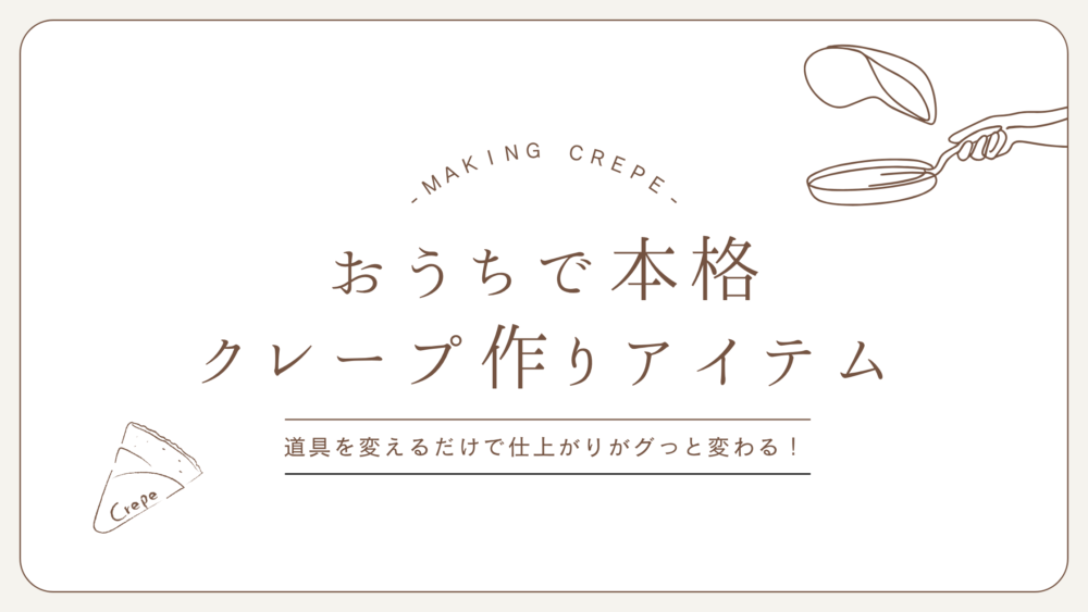 道具TwitterFacebookはてブPocketLINEコピー 2025.10.14 2025.10.08初心者でも失敗しない!おうちクレープの道具ガイドクレープをきれいに焼くためには、道具選びがとても大切です。ここでは、おうちで本格的に焼けるオススメアイテムをご紹介しています。基本のアイテム一覧・フライパン・クレープパン・円鉄板・トンボ・スパチュラ・軽量カップ・泡だて器・ボウル・網・その他便利アイテム100均でも手に入るアイテムの紹介や、プロが使う道具との違いも詳しく解説していきます!